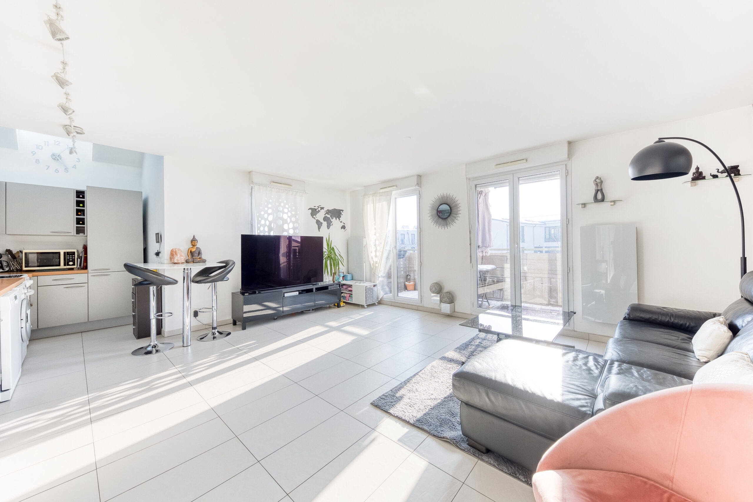 Il se compose d’un spacieux double séjour ouvrant sur un grand balcon exposé plein sud avec vue dégagée sur le jardin de la résidence, d’une cuisine ouverte, de deux chambres équipées de placards, d’un dégagement avec rangements, d’une salle de bains ainsi que de WC séparés.